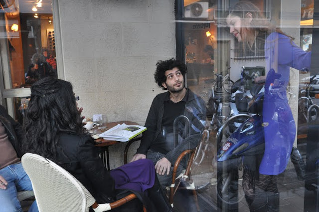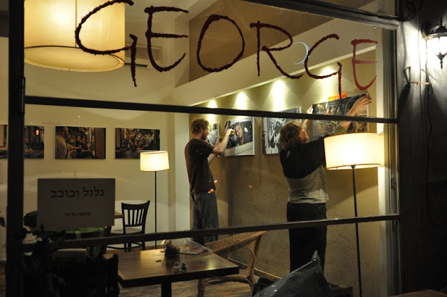 ערב שישי,בין הערביים ובין תערוכות אחת שמוסרת והשניה שנתלית מתקיימת מכירת בגדים בגורג, צלומי פלורנטין בדיאלוג עם באי קפה george יהודה הלוי 93 פינת נחמני